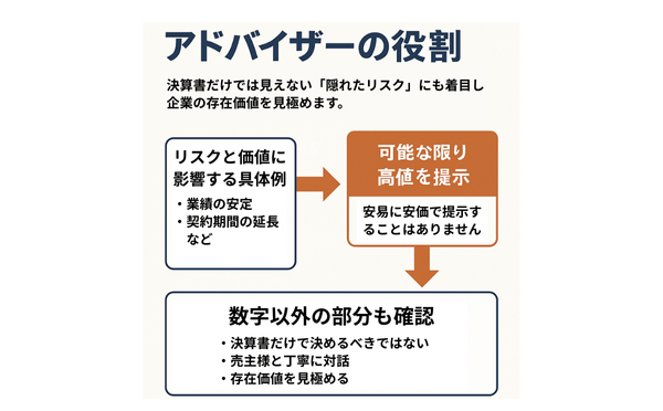 特に、決算書だけでは見えない“隠れたリスク”があるため、そこに光を当てて、最大値をつけることがアドバイザーの重要な役割です。