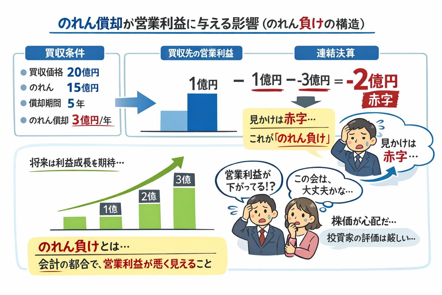 将来的に利益が伸びる(1億円→2億円→3億円……)と見込んで20億円で買ったとしても、買った直後の決算では営業利益が下がってしまう。これを「のれん負け」と呼びます。