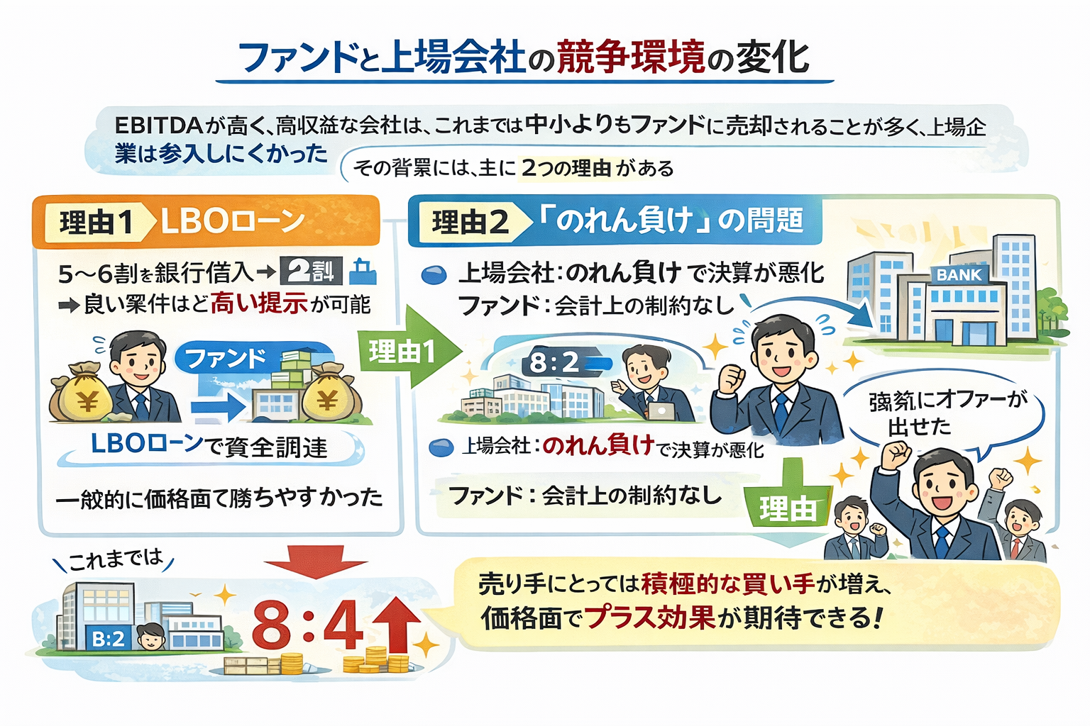 そのため、良い案件には、一般論としてファンドの方が高い金額を提示してきます。上場会社もシナジーが強く働けば高い提示をしますが、基本的にはファンドに勝てないことが多いのです。