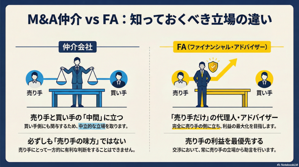 会社の売却を検討する際、「複数の仲介会社に依頼した方が買い手が見つかりやすいのでは?」と考える方は少なくありません。確かに、一見すると選択肢が増えるように思えるかもしれません。しかし実際には、「仲介」と「FA(ファイナンシャル・アドバイザー)」の立場の違いを正しく理解しておかないと、思わぬリスクを招く可能性があります。