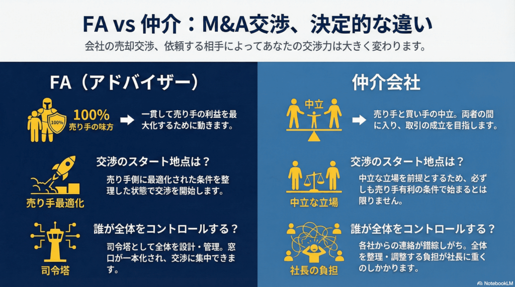 確かに、3社に依頼できれば、単純計算では、「3倍の動きが期待できそうだ」と感じるかもしれませんが、もう一つ重要な論点があります。それは、相手が「売り手のFA(アドバイザー)」なのか、それとも「仲介」なのかという点です。