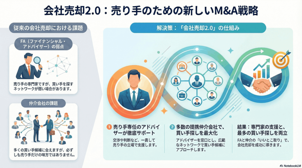 売り手の社長様にとっては、会社売却2.0の仕組みがベストだと考えています。