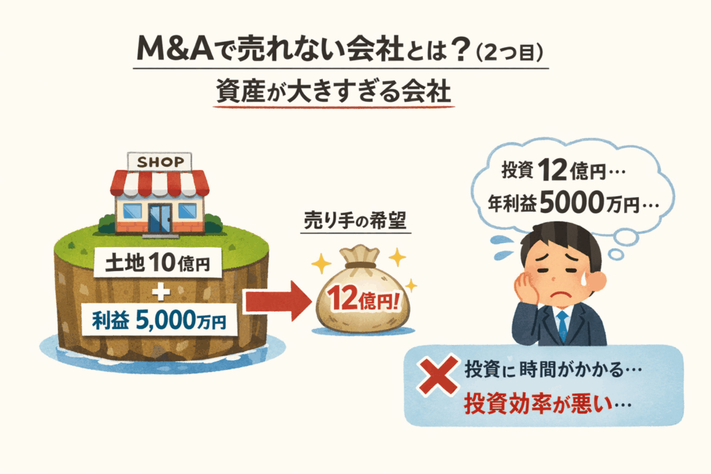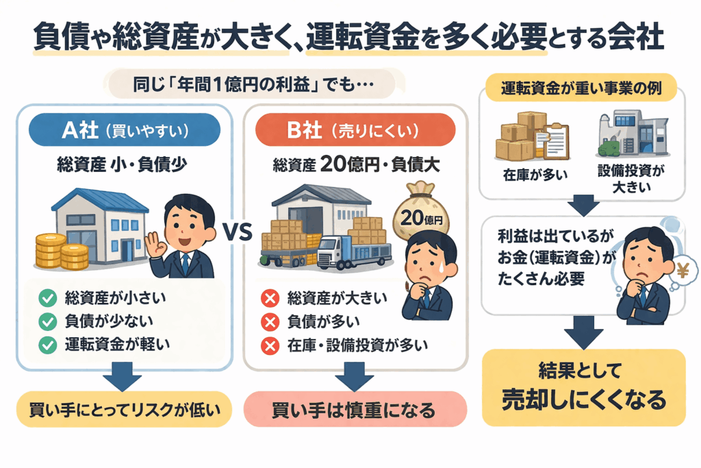 在庫を多く抱える会社や、設備投資が大きい会社は、利益が出ていても、その利益を維持するために多くの資金を必要とします。 そのため、買い手からすると「利益はあるが、資金負担も重い会社」に見えます。
