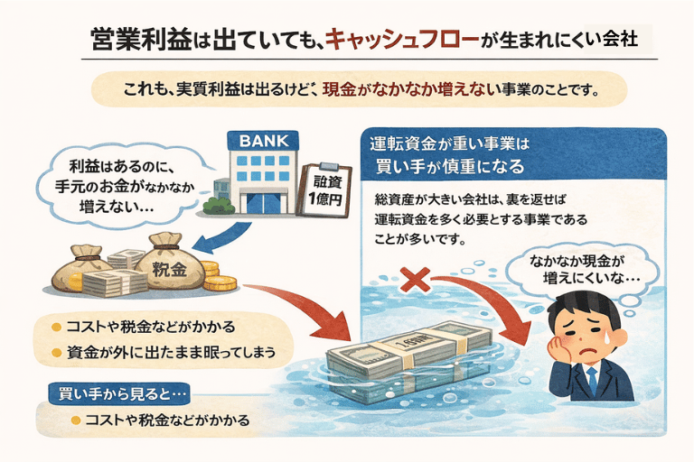 どれだけ会計上の利益が出ていても、現金が回ってこない事業は、買い手からすると魅力が落ちます。