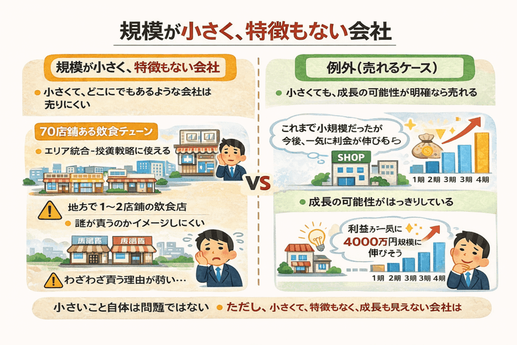 つまり、小さいこと自体が問題なのではなく、小さくて、どこにでもあって、伸びしろも見えにくい会社が売りにくいのです。